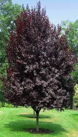 The Nigra flowering plum is a striking tree known for its deep purple leaves and beautiful pink blossoms in spring. This low-maintenance tree thrives in full sun and well-drained soil, making it easy to grow and care for. Perfect for adding a unique visual interest to your outdoor space.