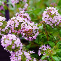Thymus 'Pink Buttons' is a low growing evergreen perennial herb with aromatic foilage & masses of rounded pink flowers in summer. It forms a dense, ground-hugging carpet, making it suitable for low-maintenance areas, cascading over walls, or in containers. It thrives in full sun and well-drained soil, tolerating dry conditions once established